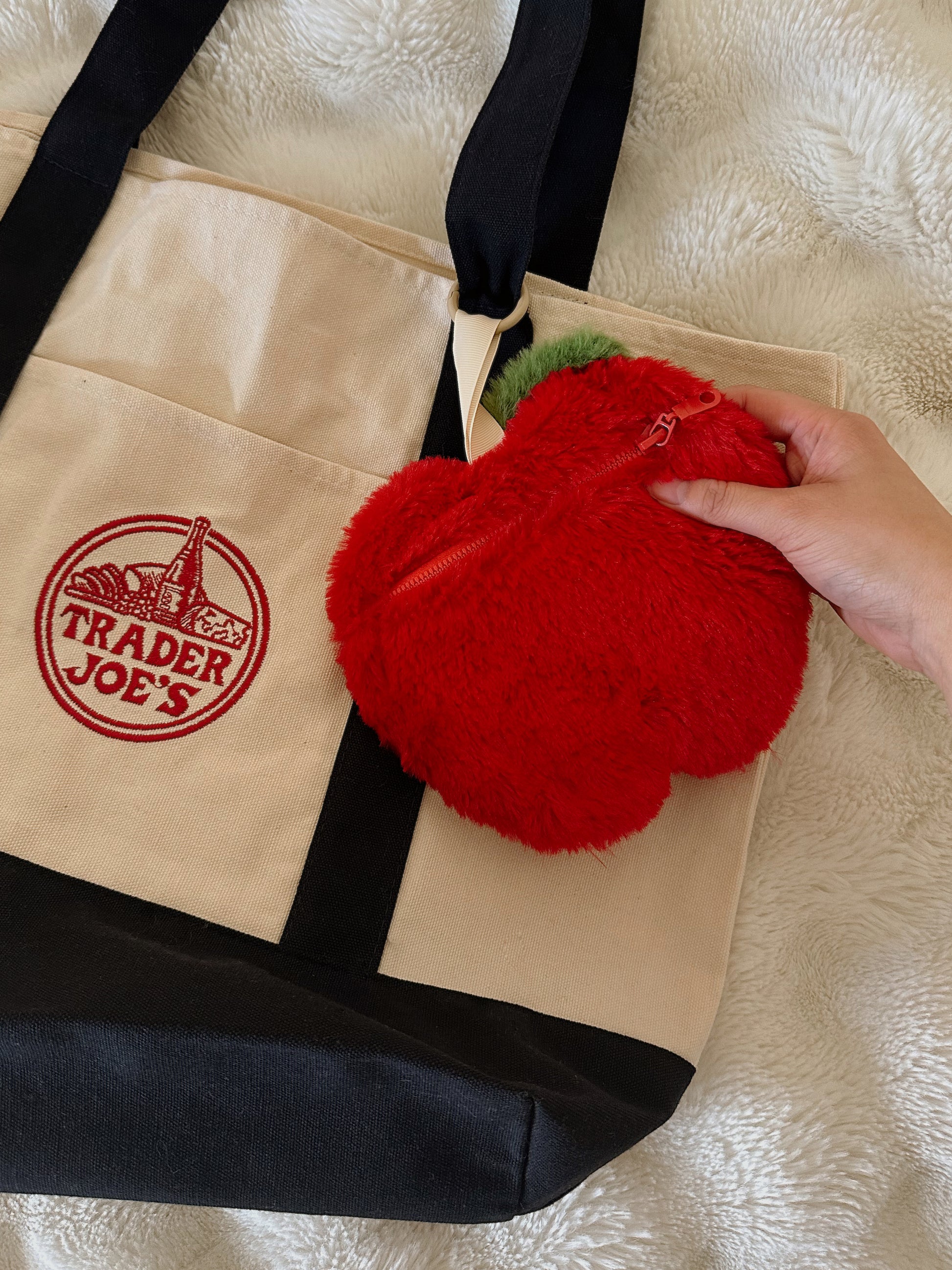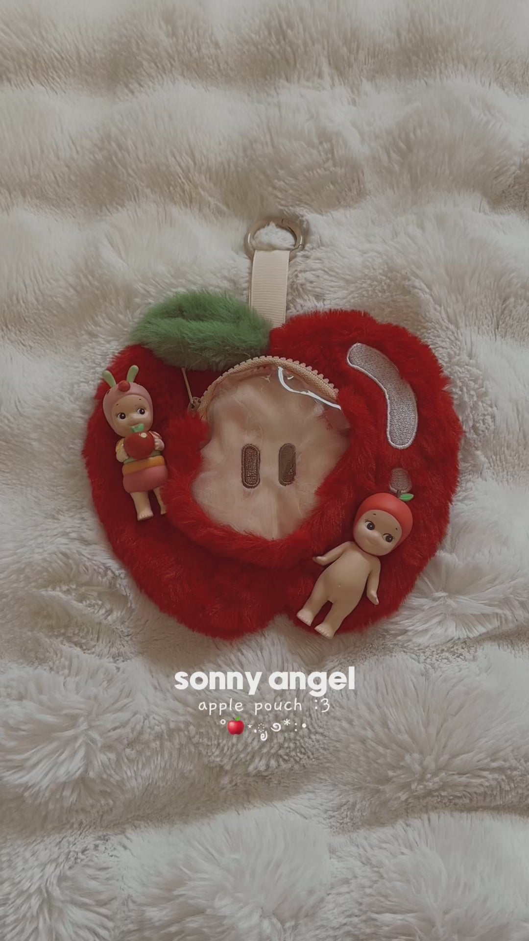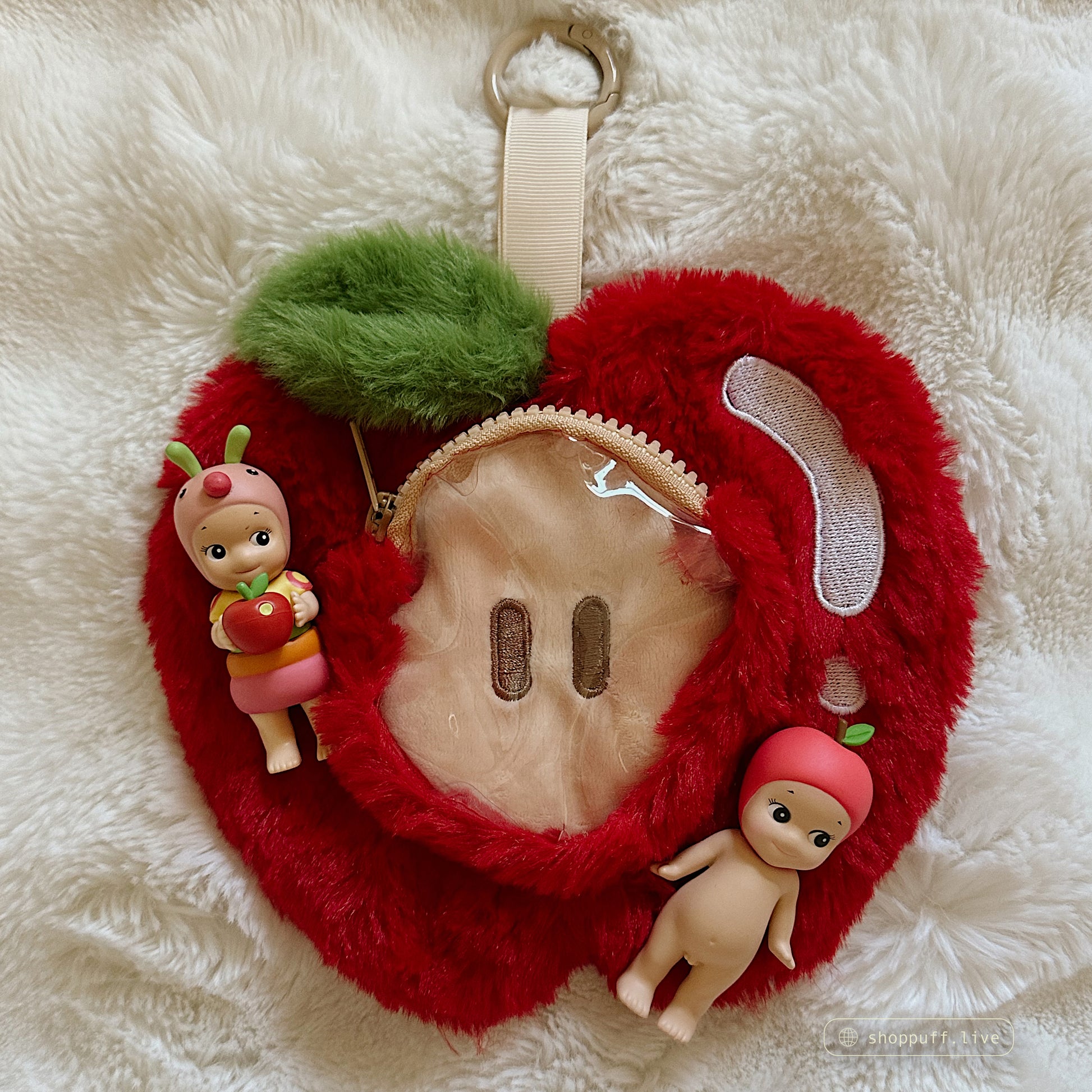 Introducing our Red Apple Trinket Pouches! These pouches have two partitions— a clear zippered pouch in the front, and one discreet pocket in the back! If you love carrying your trinkets with you but they don't have a keychain attached to them (such as Sonny Angels, Smiskis, Calico Critters, Etc.), this would be the perfect bag accessory!