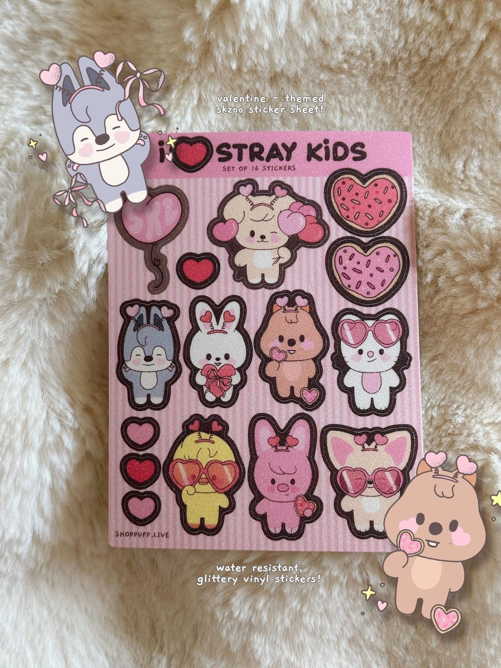 Have SKZOOs be a part of your Valentine's Day festivities this year by collecting this sticker sheet! ♡ This sticker sheet is printed on frosted glitter vinyl, making them extra durable and water-resistant compared to your regular, paper stickers! We also have a matching SKZOO refoldable tote bag coming soon, currently on Pre-Order!